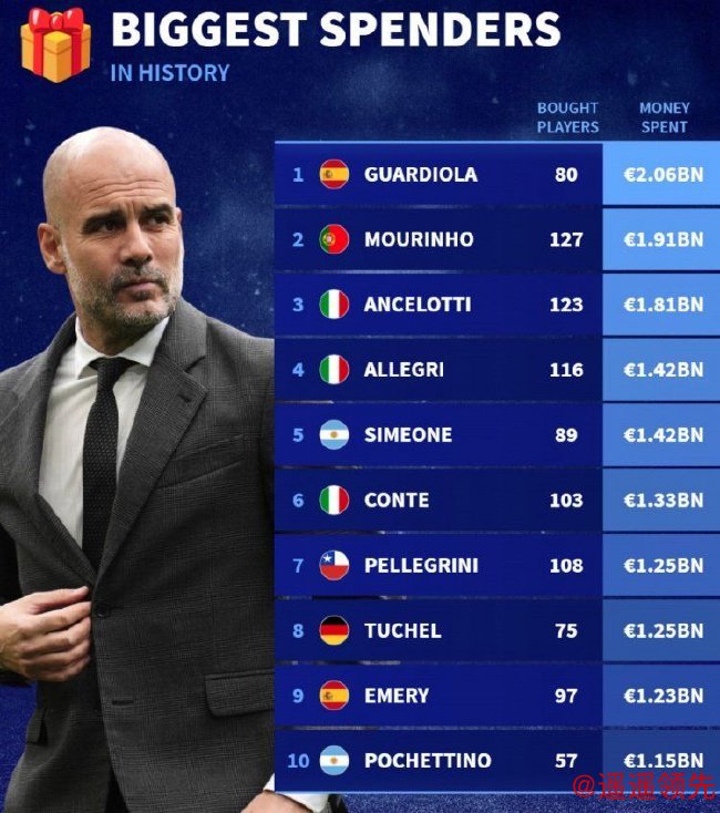 瓜迪奥拉排名榜首,他所执教的球队共计支付了20.6亿欧元购买新援,涉及80名球员。穆里尼奥花费19.1亿排名第二,皇冠体育app安切洛蒂18.1亿排名第三。