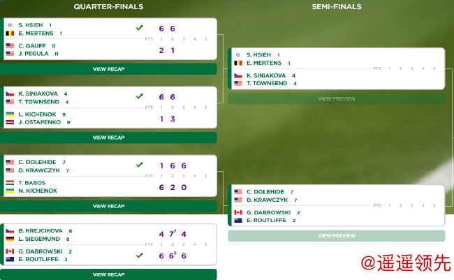 此外,女双1/4决赛赛果如下:头号种子谢淑薇/梅尔滕斯直落两盘,以6-2/6-1横扫11号种子高芙/佩古拉,7号种子多勒海德/克劳茨克在先输一盘的情况下,连扳两盘,以1-6/6-2/6-0逆转巴博斯/N-奇琴诺克,成功晋级四强。