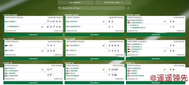 2024温网公开赛正赛于当地时间7月1-14日举行。正赛第九日展开男、女单1/4决赛,但其它赛事因受到雨水影响,最终当日只完成了9场比赛,原定的6场有中国选手的比赛(包括元老赛、青少年男单和轮椅网球)均未能完赛或取消。